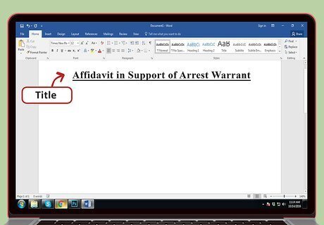 Title your document. You can title your document “Affidavit in Support of Arrest Warrant” or “Affidavit in Support of Search Warrant.” Put the title in bold and underlined. Center it between the right- and left-hand margins.