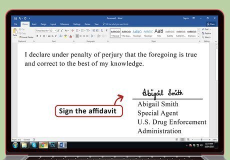 Sign the affidavit. Just below the conclusion, you should state that you are signing the affidavit under penalty of perjury. Sample language could read: “I declare under penalty of perjury that the foregoing is true and correct to the best of my knowledge.” Sign your name underneath this declaration.