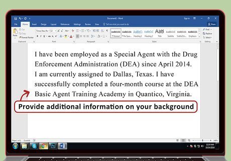 Provide additional information on your background. You should go into detail about your professional expertise, such as how long you have been employed as an officer and what kind of specialized training you have. For example, you could write, “I have been employed as a Special Agent with the Drug Enforcement Administration (DEA) since April 2014. I am currently assigned to Dallas, Texas. I have successfully completed a four-month course at the DEA Basic Agent Training Academy in Quantico, Virginia.”