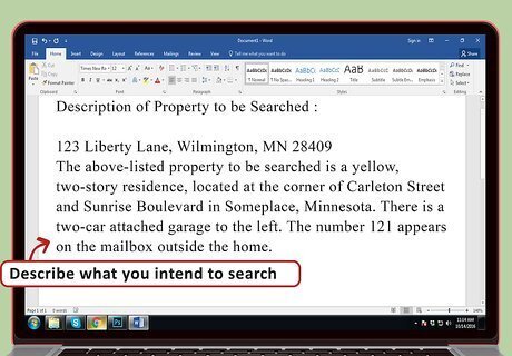 Describe what you intend to search. If you are trying to get a search warrant, then you need to explain in detail the person, place, or thing that you intend to search as well as what you intend to seize. A search warrant doesn’t give police the right to search anything they want or to take anything that looks interesting. Instead, identify with particularity what you want to search. You can then add these descriptions as attachments. For example, you could identify a piece of property you want to search. Title it “Description of Property to be Searched” and provide the address. Your description of the property could read: “The above-listed property to be searched is a yellow, two-story residence, located at the corner of Carleton Street and Sunrise Boulevard in Someplace, Minnesota. There is a two-car attached garage to the left. The number 121 appears on the mailbox outside the home.” Also identify what you want to seize. In addition to the drugs themselves, you should take other evidence of the crime, such as banking and financial records, communications related to the crime, etc. Be as comprehensive as possible.