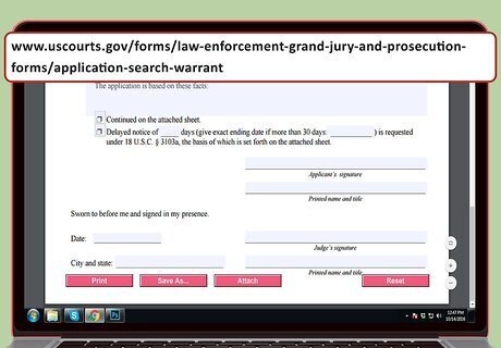 Complete the application for a search or arrest warrant. You attach the affidavit in support of your application for a warrant. Accordingly, you should fill out the application after finishing your affidavit. Ask a colleague for the correct form. Most applications ask you to list your reasons for finding probable cause. You can type in “See attached affidavit.”