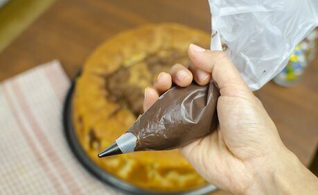 Write your message with a piping bag. Fill a piping bag with a frosting or icing that is soft enough to flow from the piping bag. Use the line nozzle of your piping bag. If you haven't got a piping bag, you can try putting your frosting or icing in a sandwich bag and cutting a tiny piece from the corner of the bag you can squeeze out your message. A cone of baking parchment with a corner snipped off us another option. Practice writing your message on a plate before trying on the cake to see how easy the frosting is to work with. By piping onto a plate, you can scoop it off and place it back in the piping bag. Squeeze the bag gently and go slowly. Be extra careful at the end of each letter.