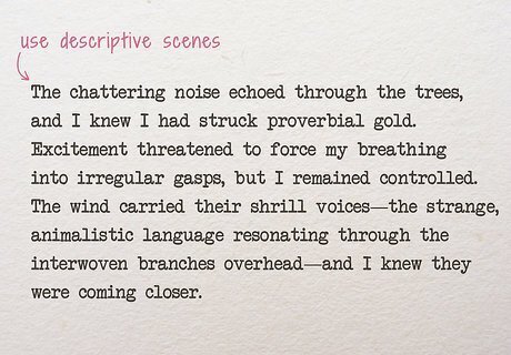 Use descriptive writing to draw readers into your world. Descriptive paragraphs or scenes help your audience envision the key characters and settings in your novel. The trick is to provide enough descriptive detail to spark the reader’s imagination, rather than force-feeding them loads of excessive details. As with most aspects of writing, practice makes perfect! Practice writing descriptive paragraphs that introduce each of your main characters and settings. Start with a brief, catchy sentence that provides a simple yet intriguing fact about the character/setting, then use vivid descriptive phrasing to build the rest of the paragraph.