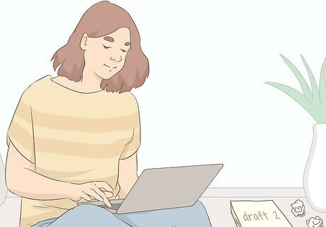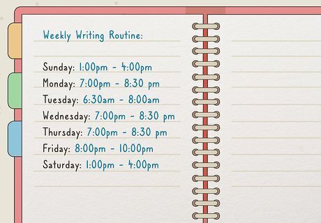 Set up a writing routine that works for you. To complete your first draft, you'll need to find a time and place that is conducive to your writing goals. You can write at the same time every morning or evening, write in short bursts throughout the day, or write in long bouts three days a week. Don’t wait to write only when you feel spurts of inspiration. Instead, treat writing like the real work it is and stick to a regular routine. Try scheduling a specific writing time into your daily calendar. Even if you don’t really feel like writing then, or just can’t get the words to come out, sit down during your scheduled time and work at it. Create a writing space to help you get into a routine. Find a cozy place where you can focus. Invest in a chair that won't cause back pain after a couple of hours of sitting and writing. You’ll be spending a lot of time in this place, so make it comfy and functional!