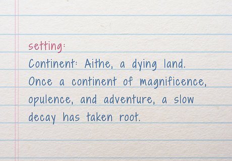 Develop an expansive, captivating setting for your novel. The setting for your novel goes beyond the particular city where your characters will dwell; you've got an entire universe to dream up! The setting you create will determine the mood and tone of your novel, and will affect the problems your characters will face. Think about these questions as you sketch out the parameters of the new world you're creating: Will it be loosely based on places that are familiar to you in real life? Will it be set in the present, or in some other time? Will it take place on Earth, or somewhere imaginary? Will it be centered in one city or neighborhood, or expanded to a range of locations? What kind of society does it take place in? Will it take place over the course of a month, a year, or decades?