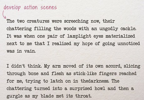 Don’t ignore action scenes, no matter your genre. Sure, thrillers need to have a lot of action, but so do gentle romances—just a different type of action! Develop scenes or episodes that bring characters into conflict or force key interactions. The more three-dimensional and relatable you make your characters, the easier it will be to make action scenes that draw readers in. Depending on your writing style, you might draft 8-10 key action scenes first, then build the rest of the novel around them. You don’t need to create action for action’s sake—not every novel needs a high-speed car chase! But, every novel benefits from key moments when critical actions are introduced and described.