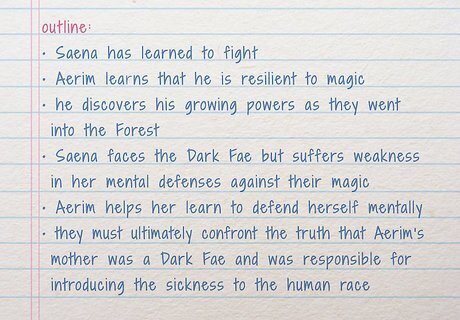 Make an outline if you want to map out your novel. Creating an outline can be a good way to map out your ideas and give you small goals to accomplish as you work toward the larger goal of writing an entire book. But, if you write better “from the hip” and without all the details in place, just let yourself get inspired and write whatever feels right. Your outline does not have to be linear. You could do a quick sketch of each character's arc, or make a Venn diagram showing how different characters' stories will overlap. Your outline is a guide, not a contract. The point is simply to jump-start the writing process with a visual representation of where the story might go. It will certainly change as you begin the writing process. Keep updating or recreating your outline throughout the process. Sometimes an outline can actually be more helpful after you've completed a draft or two of your novel.