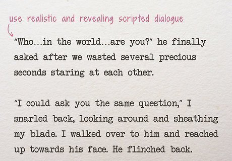 Include scripted dialogue that is realistic and revealing. Most novels include dialogue between characters, and the quality of this dialogue can greatly impact how a reader perceives the overall quality of the work. Stilted, unrealistic, or cheesy dialogue pushes a reader’s imagination away from your world, while relatable, engaging dialogue draws them into it. Writing great dialogue is a challenging art, but listening to how people speak to each other is a great starting point. Listen to people talk to each other and observe how their conversations are—or aren’t—propelled forward and deepened by what they say. Flesh out your characters fully so that you can envision them speaking the dialogue that you write for them. Make sure the content and style of the dialogue suits the character. Don’t use dialogue to dump information on the reader. Instead, use it to humanize your characters, create conflict, and propel the narrative.