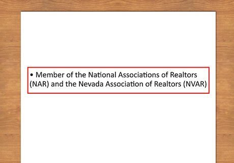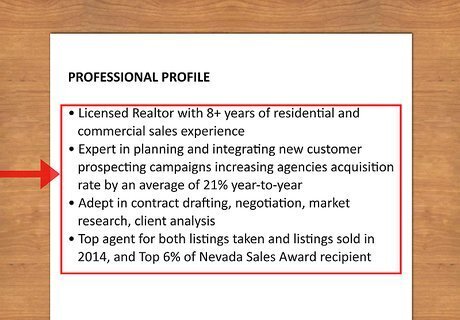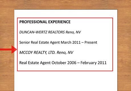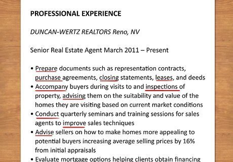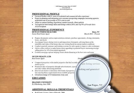 Use your professional profile to highlight your experience and skills. Traditionally, resumes have included an "objective" detailing your hopes for your job search. Today, recruiters recommend providing a professional profile or "career summary" instead. This profile will immediately follow your contact information on your resume. Your goal is to powerfully demonstrate that you are the one to meet your prospective employer's needs. Specifically state your licensing qualifications and experience. In addition, you should include a summary of information including the areas you service (by cities, counties, postal codes, and states), your total years of experience, and whether you do commercial and/or residential work. Mention the type of real estate with which you're most experienced. This allows both you and recruiters to avoid poor "fit" -- if you're a skilled home seller, for example, you would be wasted in industrial property sales. Add information about something you do exceptionally well, any additional complementary skills, and any impressive achievements or awards. Use hard numbers to showcase your skills and achievements. A sample professional profile might begin, "Licensed real estate agent with 12 years of residential sales experience at both local and national real estate firms." Bullet points can then highlight that you are an expert in developing new business, increasing your last agency's client base by 18 percent in two years; highly skilled in conducting market research; and hold an Accredited Buyer's Designation from the National Association of REALTORS®.