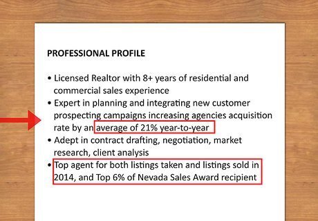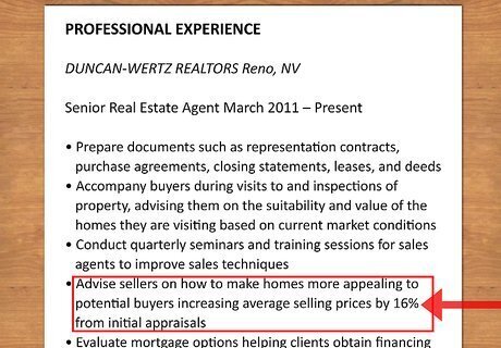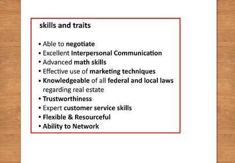 Cite additional skills that illustrate your usefulness. Computer skills are a must in this day and age; be specific about how you can use computer technology to positively impact an organization (social media successes, for example). Other in-demand skills in the real estate industry include negotiation and interpersonal communication skills, math skills, marketing knowledge, understanding of federal and local real estate laws, trustworthiness, customer service, flexibility, resourcefulness, and the ability to network. Provide an example whenever possible. You might, for example, list that you've established a Facebook page to post your firm's key listings, with highlighted properties receiving an average of 15 "shares." This demonstrates you know how to use social media to substantially increase the visibility of your listings.