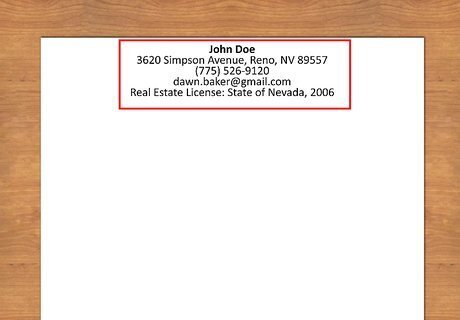 Start with your contact information. Like all resumes, your real estate resume should feature your name, address, phone numbers and email address on the top of the page. Provide your license number, if you have one, and list the state(s) in which you are licensed.