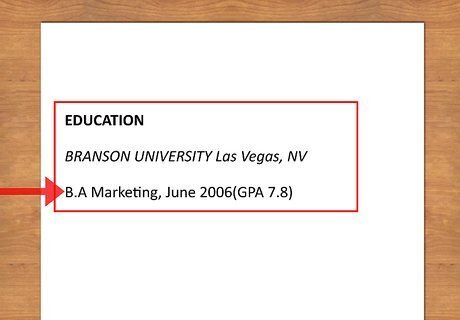 Include your grade point average. Any resume-writer may opt to include GPA in the education section of his or her resume, but this is especially important advice for a recent graduate. This helps you demonstrate your aptitude as a student and show that you took your education seriously. If your cumulative GPA is less than 3.0, consider calculating and including your major GPA. Only do so, however, if it works out to an average above 3.0.