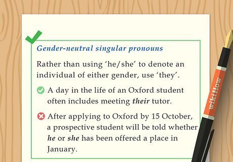Discuss gendered pronouns. Another area you may want to address is pronoun use. It's generally not acceptable to just use "he" when you're discussing a generic person. That means you have to decide how to use pronouns to avoid this issue. For instance, you can use "he or she." Another option is alternating between "he" and "she" on different examples. "They" is also becoming more commonplace as a non-gendered option for the singular pronoun, such as "The doctor ate an apple. They spit out the seeds."