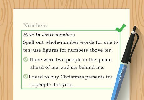 Address how numbers will be written. Numbers need clarification because how you use them can vary widely from place to place. For instance, some guides have you write out any number 10 or below, while others prefer numerals all the time. Your organization may only prefer numerals for measurements, while spelling out other numbers. Decide what's most appropriate for your organization. For instance, if your organization uses a lot of scientific measurements, you may want to mandate using numerals for measurements. You'll likely have many numbers with decimal points, which can get confusing when written out.