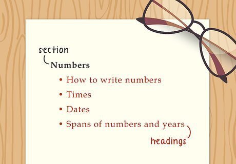 Create clear sections and headings. Decide what sections you think your style guide needs. Write clear headings for each of these sections, and establish a well-thought-out order for the sections. For instance, you may want sections on common mistakes, your organization's stylistic choices, tone, formatting, and preferred words and acronyms. At the end, you may want a quick reference section and an index. Divide these sections up with subheadings as needed to make it easy to flip through the guide. Add tabs to the pages after printing or use black markers printed on the edge of the page to delineate sections.