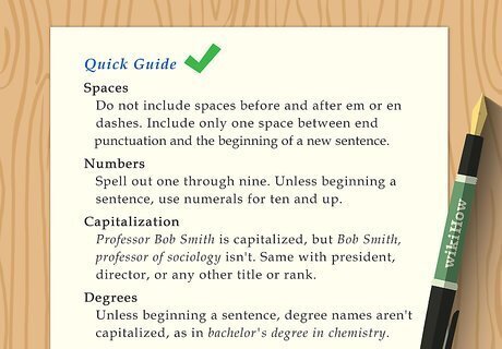 Discuss document formatting, including margin size and font choice. Ideally, formatting would be automatically applied within your organization's software. If it's not, though, you can include a quick section on your preferences, such as margin widths, font choices, and heading styles. You can also include information on how you prefer to style bullet points, hyphens, and quotations.