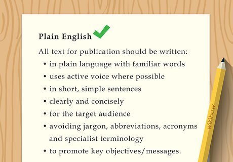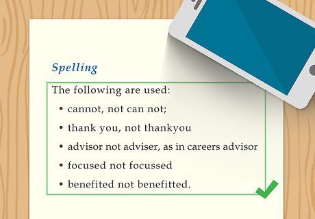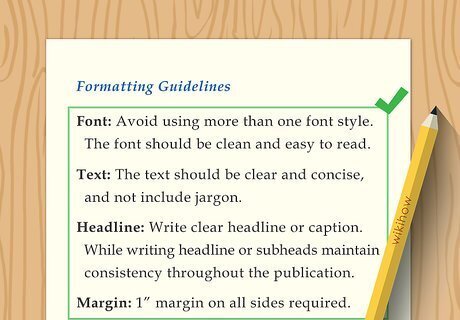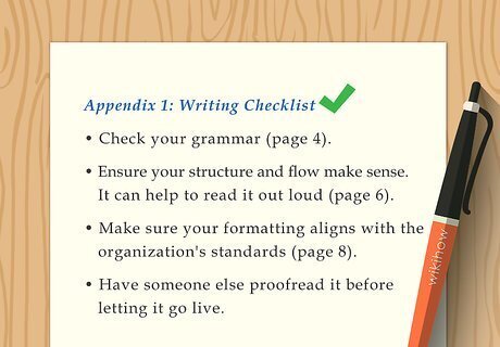 Add a writing checklist. Add items to the list that you want them to check once the piece is written to make sure the writing follows your style guidelines. Include a page number where they can find out more about each rule you're emphasizing. For instance, your list might look this way: Check your grammar (page 4). Ensure your structure and flow make sense. It can help to read it out loud (page 6). Make sure your formatting aligns with the organization's standards (page 8). Have someone else proofread it before letting it go live.
