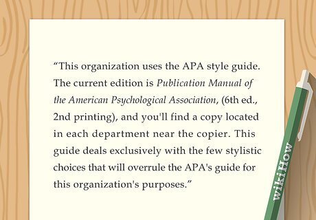 Establish the base guide early on. If you're using another guide as a base, make that clear in the introduction. That way, your readers know what to refer to for the majority of the information they may need. Tell your readers where the base guide can be found, whether in your office or online. For instance, you might write, "This organization uses the APA style guide. The current edition is Publication Manual of the American Psychological Association, (6th ed., 2nd printing), and you'll find a copy located in each department near the copier. This guide deals exclusively with the few stylistic choices that will overrule the APA's guide for this organization's purposes."