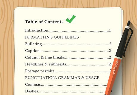 Make the table of contents one of the first pages. The table of contents establishes the structure of your guide, making it easy to find everything else. Therefore, it should be right up front so your readers can find it easily. To organize your table of contents, place the main headings on the page in a bold font over to the left. Place page numbers indicating where these headings are justified to the right. Add subheadings and page numbers under each heading in a regular font. If your style guide is on a website, place the table of contents at the top. Each heading should be a link to the appropriate section.