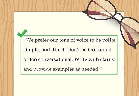 Describe the tone of voice you prefer. Tone of voice refers to how you want your writing to come across to the reader. Your tone of voice can be conversational, quick and choppy, or formal, just to name a few. It's established by things like sentence length, word choice, and sentence structure. The best way to help your readers understand the tone you want is to first describe it to them in a simple paragraph and then provide examples. For instance, you could write, "We prefer our tone of voice to be polite, simple, and direct. Don't be too formal or too conversational. Write with clarity and provide examples as needed." Then you can add an example: "Here's an example of what we're looking for: Welcome to our website! We're happy to have you here. We'd love to help you get started, so just click below to find out more."