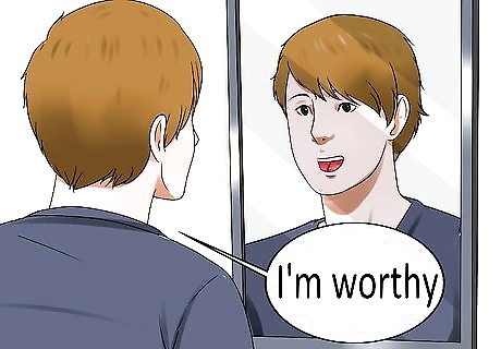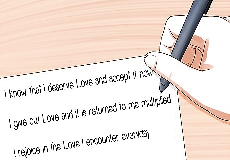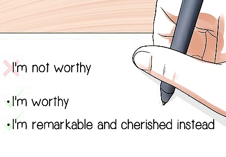 Write out an affirmation that offers you the positive flip-side of your negative beliefs about yourself. The vocabulary you use is extremely important. It should be emotionally evocative in ways that resonate with you personally. You may want to use a thesaurus to find words that move you more powerfully. For example, instead of replacing "I'm not worthy" with "I'm worthy," you could choose "I'm remarkable and cherished" instead. It can also be helpful to imagine the positive aspects of yourself that you wish you could use to counter negative beliefs. If someone finds you lazy, making you think that you are not worthy, you might want to show the world that you are sensitive and discerning about your actions. Instead of "I'm worthy" you might say "I'm sensitive, discerning, and remarkable." If you are easily moved by music, you might consider adding a simple rhythmic or tonal element to jump-start your emotional attunement to the affirmation. Your affirmations should be evidence-based and be something you actually truly believe.