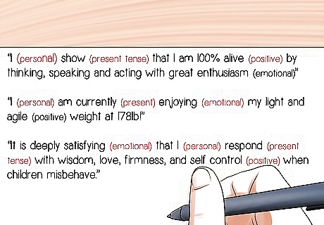 Foster an attitude of possibility rather than difficulty. The use of reactive phrases will subtly suggest that the world is working against you. These are phrases like "I hope", "I will try", and "I should". Affirmations that take into account all of the above will look like these: “I (personal) show (present tense) that I am 100% alive (positive) by thinking, speaking and acting with great enthusiasm (emotional)” “I (personal) am currently (present) enjoying (emotional) my light and agile (positive) weight at 178lb!” “It is deeply satisfying (emotional) that I (personal) respond (present tense) with wisdom, love, firmness, and self control (positive) when children misbehave.”
