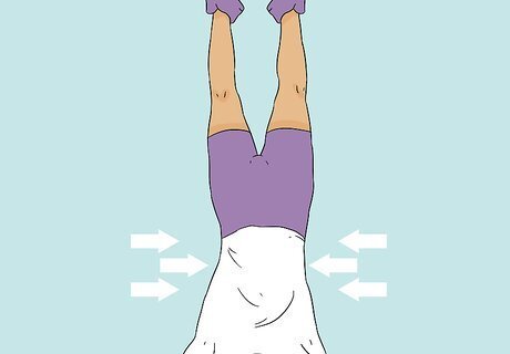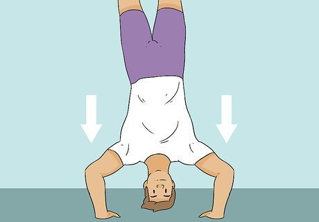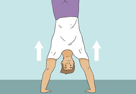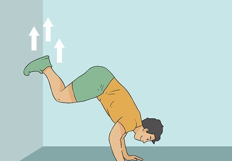 Kick up into a handstand against the wall. Start by rocking forward and backward to generate momentum. Afterward—as you rock forward—kick one of your legs straight behind you, followed by your other leg. Press down on the ground to lift yourself up and rest your toes or the soles of your feet against the wall. Keep your back slightly arched. If you're having trouble holding yourself up, bring your legs back to the ground and keep practicing your kick ups before proceeding to the next step. If it feels more comfortable, bend your first leg slightly after kicking it up. Make sure your head lines up between your arms instead of leaning it back against the wall so you keep your spine straight.