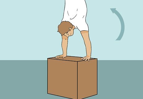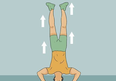 Grab a plyo box and kick up to the ceiling if you want a greater challenge. Plyo boxes are used mostly in Crossfit and add extra support. Check that your biceps are parallel to your ears and extend one foot with your toes pointed to the floor. Start rocking backward and forward to create momentum. After gaining momentum for 2 to 3 seconds, kick yourself up with your feet, making sure that your back foot leaves the ground before your bent foot. You may have to kick harder rather than softer—it's easier to decrease your speed to balance compared to increasing your speed to compensate for too little balance. If you over kick, turn sideways and cartwheel yourself to your feet.