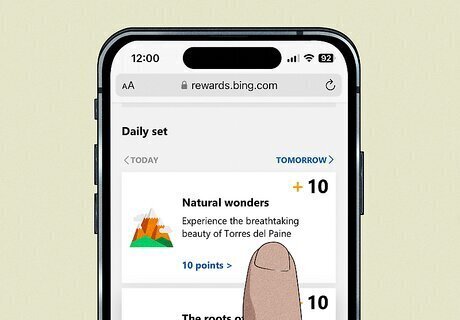 Complete daily activities. Head to rewards.bing.com every day to receive a new set of activities to complete for extra points. Scroll down to the "Daily set" section to see available activities (like reading fast facts, taking short quizzes, and participating in polls) and how much you'll earn once you complete them. Scroll down even further to find additional activities to complete.