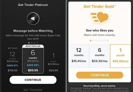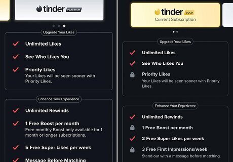 Tinder Gold offers many of the same features as Platinum, but not all. Tinder Platinum is the ultimate Tinder subscription plan. Tinder Gold is a close second and includes many of the same features as Platinum; however, the three features it excludes may be a deal-breaker for some. Unlike Tinder Platinum, Tinder Gold does not include Messaging before Matching, Prioritized Likes, or the ability to see sent Likes from the past 7 days. Messaging before Matching lets you chat with potential Matches before swiping. Prioritized Likes ensures your Likes and Super Likes are seen first by a potential Match.