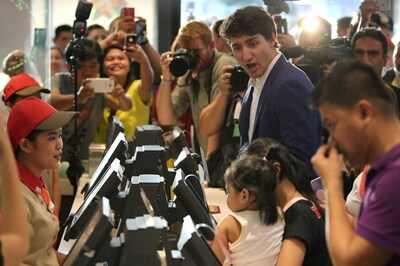 Canada's Prime Minister Justin Trudeau, in Manila for a summit of regional leaders, dropped in at an outlet of fastfood giant Jollibee Foods Corp after a visit to a nearby women's clinic that advocates family planning, a touchy subject in the Catholic-maj...